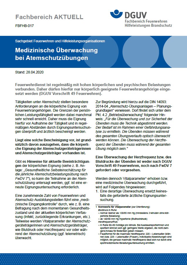 Feuerwehrdienst ist regelmäßig mit hohen körperlichen und psychischen Belastungen verbunden. Daher dürfen hierfür nur körperlich geeignete Feuerwehrangehörige eingesetzt werden (DGUV Vorschrift 49 Feuerwehren).