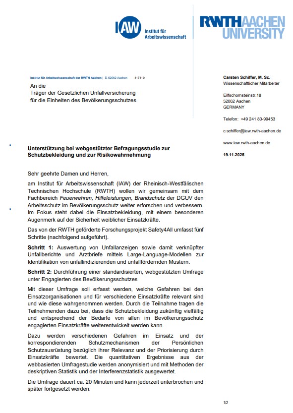 Das Institut für Arbeitswissenschaft der Rheinisch-Westfälischen Technischen Hochschule (RWTH) will gemeinsam mit dem Fachbereich Feuerwehren, Hilfeleistungen, Brandschutz der DGUV den Arbeitsschutz im Bevölkerungsschutz weiter erforschen und verbessern.