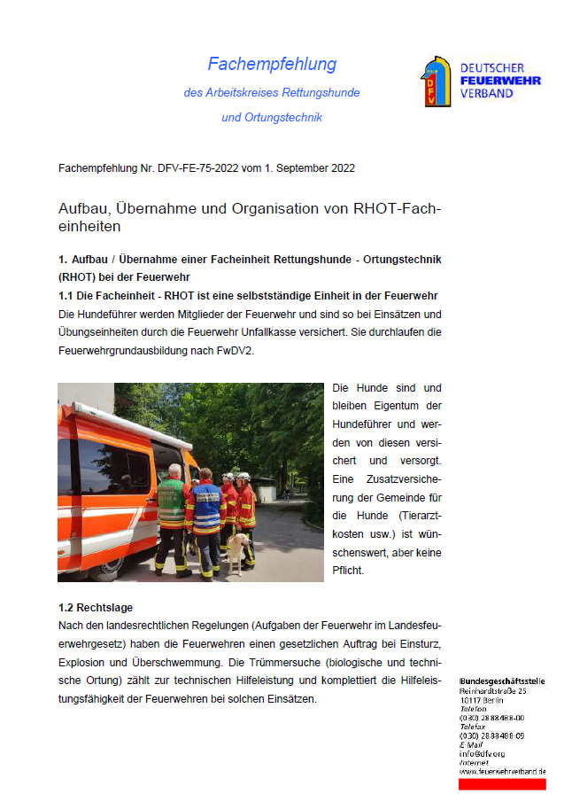 1. Aufbau / Übernahme einer Facheinheit Rettungshunde - Ortungstechnik (RHOT) bei der Feuerwehr